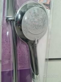 Asta saliscendi in acciaio nero opaco con mensoletta portasapone, doccino nero/cromo e flessibile cromo da 150cm, inclusi tasselli e viti di fissaggio. Nuovo, in confezione originale.