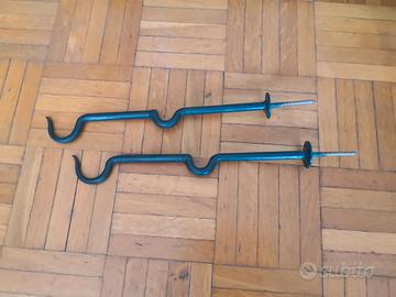 Vendo due serie di aste per tende, ognuna composta da due aste, una con terminale a spirale e una con pomello. Inclusi 6 sopporti doppi come da foto, con rosetta a corolla in ferro battuto. Le aste sono lunghe 240 cm, con i terminali diventano 266. Diametro dei tubolari delle aste: 20 mm la piccola a pomello e 32 mm la più grande a spirale. Colore: blu petrolio come da foto. Inclusi anelli dello stesso colore e pinze bronzate.
