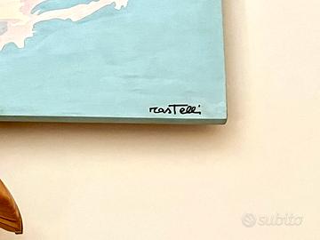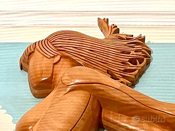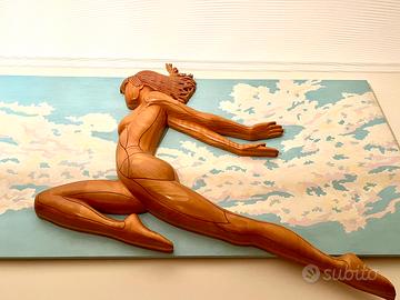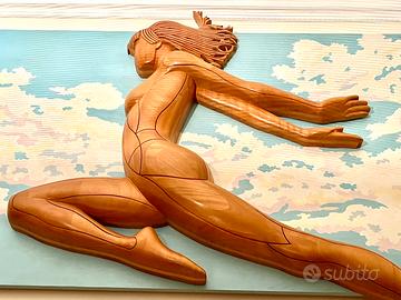 Splendida scultura in legno raffigurante una figura femminile in movimento, come se stesse volando tra le nuvole realizzata in legno pregiato. Dettagli finemente intagliati. Pannello/Sfondo dipinto con cielo e nuvole. Le misure sono 240 cm lunghezza; 110 cm altezza del pannello su cui è appoggiata l’opera. Le opere di Giorgio Rastelli (Milano, 1940), noto scultore specializzato in sculture in legno hanno quotazioni nel mercato le sue opere appaiono periodicamente in asta, ad esempio su Dorotheum, Farsettiarte, Pandolfini e Capitolium Art.