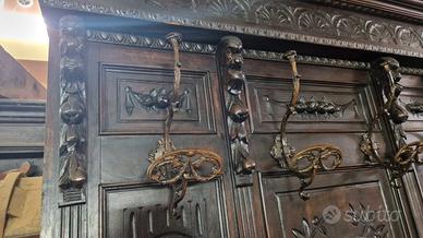 Imponente appendiabiti antico di fine '800 in stile Neo Rinascimentale in legno di noce,decorato con un simbolo araldico,un profilo di cavaliere e mascheroni.