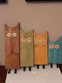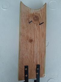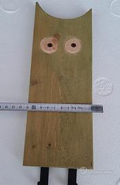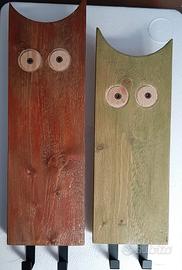 gufetto appenditutto in legno grezzo lavorato e dipinto a mano con due ganci in ferro e viti lunghe per fissaggio al muro con tasselli.