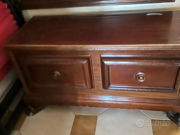 un mobile appendiabiti da ingresso in legno con panca contenitore e pannello in tessuto rosso. Panca 41x98cm Attaccapanni 130x 110cm