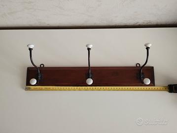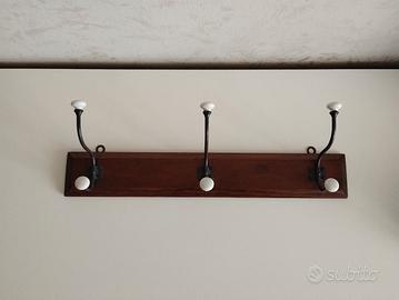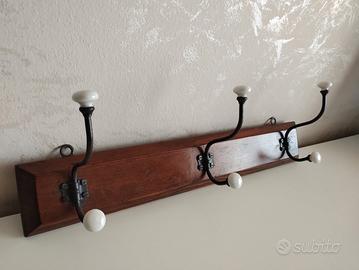 Attaccapanni da parete d'epoca, in legno metallo e ceramica.