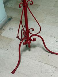 Attaccapanni vintage autoportante in ferro pieno, colore rosso lucido, con eleganti decorazioni a ricciolo in stile liberty.
