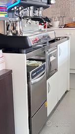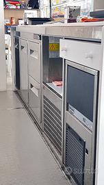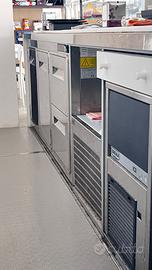Due banchi uno completo di atrezzatura Bar , l’altro genetico punto vendita . Il banco bar comprende , cella frigo , macchina ghiaccio , lava tazzine , due cassetti refrigerati , vetrina dolce/salato alzatina stessa altezza della vetrina, abbinati al tutto possiamo fornire anche 3 tavoli con relative sedie