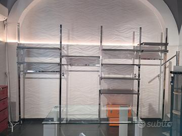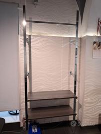 Espositori in acciaio e mensole in legno color grigio in ottimo stato. Le mensole e tutta l'appenderia è smontabile e componibile in qualsivoglia maniera.