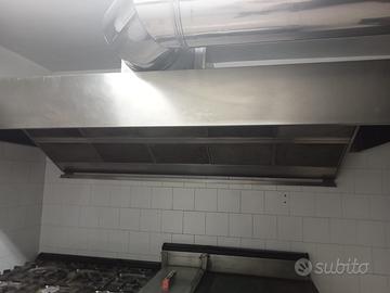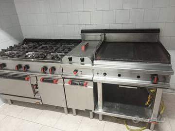 Per cessata attività vendesi cucina in acciaio inox, marca Angelo Po', composta da cucina industriale a 6 fornelli, friggitrice a gas con 2 cestelli da LT. 12 e fry top a gas, il tutto di lunghezza mt. 2,20 e cappa di lunghezza mt. 2,40.