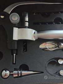 vendo set attrezzi sommelier, in confezione regalo con elegante scatola in legno. costituito da 10 utensili da vino: cavatappi a leva, tappo bottiglia, termometro, taglia pellicola, aeratore, anello anti goccia e versatore. in acciaio inossidabile. misure approssimative in centimetri della scatola: altezza 8, larghezza 27, profondità 22. nuovi mai utilizzati nella loro confezione originale. euro 30