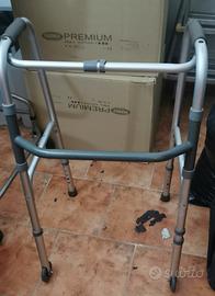 Vendo anche singolarmente gli oggetti in foto: carrellino 2 ruote basso; carrello ascellare regolabile in altezza; cuscino cilindrico in gomma gonfiabile arancione; cuscino antidecupido blu gonfiabile mai usato, nuovo;