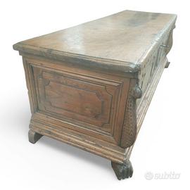 Questa cassapanca dell'area cremonese risalente alla meta' dell'700 è un vero gioiello artigianale. Il suo design rustico ma raffinato, con pannellature scolpite a mano, le conferisce un fascino senza tempo. Il piano superiore può essere utilizzato come superficie d'appoggio. Un pezzo d'antiquariato di grande pregio, perfetto per arredare con stile un ambiente classico o country. Realizzata con tecniche tradizionali, questa cassapanca cremonese è un'autentica testimonianza dell'abilità artigiana italiana.