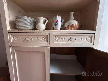 credenza/vetrina d'epoca in legno laccato bianco/panna, con caratteristiche molto interessanti. È un pezzo autentico con dettagli di pregio!