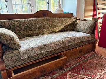 E' un vero pezzo di storia, fatto in legno semipreggiato, foderato con motivi floreali, tenuto molto bene. Un sobrio design in stile Biedermeier e la funzionalità del mobile - sono le sue qualità: lo schienale si spiega in un comodo materasso e il divano si trasforma in uno spazioso letto di una piazza. I due cassetti molto ampi possono contenere biancheria o altro.
