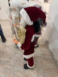Babbo Natale decorativo alto 90 cm, perfetto per le feste. - Vestito in velluto bordeaux con dettagli bianchi. - Cappello da Babbo Natale. - Cintura nera con fibbia dorata. - Sacco con regali sulla spalla. - Tiene un pacco regalo in mano.