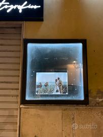 Per cessata attivita vendo bacheca in alluminio grigia illuminata internamente a led con fondo nero in metallo per l’uso di magneti piuttosto che i chiodini. Chiusura centrale. Misura esterna 120x120cm.