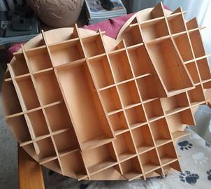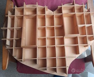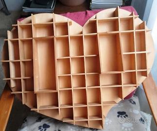 bacheca artigianale in legno con la curiosa forma di un cuore di grandi misure cm.69x58 composta di molteplici spazi per esporre vari oggetti di piccola taglia visibile al villaggio olimpico roma nord spedizioni ovunque contatti watts app