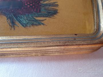 Vendo un oggetto d'arredo davvero particolare e dal grande fascino esotico: una scenografica bacheca a mezzaluna contenente un autentico ventaglio di provenienza africana. Un pezzo unico in perfetto stile "wunderkammer" (camera delle meraviglie) o etno-chic, ideale per dare un tocco eccentrico ed elegante a un salotto, uno studio o un ingresso. Caratteristiche: L'Oggetto: Il protagonista è un grande ventaglio aperto, realizzato artigianalmente con vere piume. Spiccano i colori vividi: una base di piume rosso acceso, incorniciata da lunghe piume cangianti (tipo pavone) e piume maculate (tipo faraona). Dettaglio Unico: La vera particolarità del pezzo è la presenza di due piccoli uccellini (lavoro di tassidermia decorativa) applicati direttamente sul corpo del ventaglio, che ne accentuano il carattere tribale e naturalistico. La Cornice: Il ventaglio è custodito e protetto all'interno di una bellissima bacheca in legno sagomata "a mezzaluna" (o a lunetta) che ne segue perfettamente la forma. La cornice ha una finitura dorata e un vetro protettivo frontale, mentre lo sfondo è costituito da un tessuto color senape/oro che fa risaltare le piume. Condizioni: L'oggetto è in ottime condizioni conservative generali. Il ventaglio e i suoi dettagli sono intatti e perfetti e ben protetti dal vetro. La cornice è solida e molto bella. Già provvisto di gancetto sul retro, pronto da appendere. Modalità di acquisto: Ritiro a mano a Torino (zona Santa Rita). Spedizione tracciata e ben imballata tramite TuttoSubito (garantisco imballaggio molto accurato vista la presenza del vetro). Disponibile per ulteriori foto o per visionarlo di persona. Contattatemi se interessati! prezzo trattabile