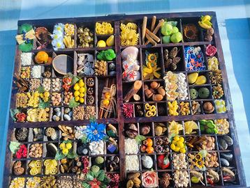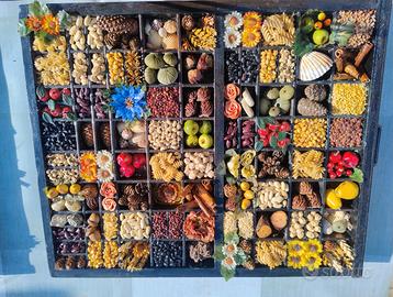 Vecchi cassetti da tipografo decorati artigianalmente con oggetti vari. Il prezzo è per una bacheca, sconto se comprate 2 o 3.