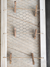 Bacheca metà lavagna da gesso e metà espositore in rete zincata con spago e mollette per affissare foto, promemoria, etc. Cornice in legno. La lavagna non è magnetica.