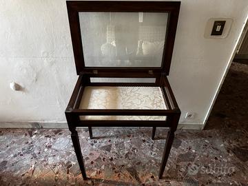 Bacheca porta oggetti in legno stile arte povera con anta in vetro apribile rivestito in stoffa. Larghezza: 67 cm Profondità: 48 cm Altezza: 72 cm