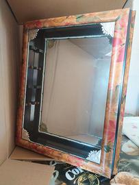 Bacheca da muro da utilizzare per esposizione di oggettistica, con chiusura calamitata; decorazione floreale con tonalità sul marrone; vetro specchiato sullo sfondo; n. 4 ripiani in verto che misurano 32,5 x 4 cm ciascuno.