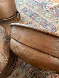 3 bacili grandi antiquariato rustico, mis. diam.40x26h, diam.39x14h, diam.31x18h e piatto diam.56, con bordi ribattuti in rame, qualche ammaccatura del tempo ma NON rotture, ribattini e manici in ferro e rame, ottimo stato e perfetti a terra per arredare angoli della casa. Ritiro a vs. cura Milano est