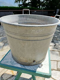 Bacinella grande in lamiera zincata . Vintage . Diametro superiore cm 75 , inferiore cm 50 , altezza cm 55 , volume stimato 160/170 litri . Tappo filettato inferiore con possibilità di sostituirlo con un rubinetto da 3/8 . Buone condizioni.