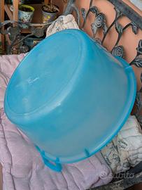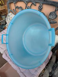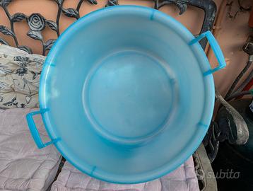 Bagnarola in plastica rigida di colore blu, ideale per uso domestico, lavanderia o giardinaggio. Dotata di manici ergonomici laterali per facilitare il trasporto anche da piena.