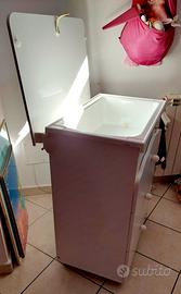 Bagnetto e cassettiera Prenatal in buone condizioni. Di colore bianco è composto da un piano apribile con all'interno vaschetta in plastica e 3 cassetti. Misure 69 x 50 cm di profondità per 90 cm di altezza, con 4 ruote piroettanti. Il mobile come da foto presenta un'imperfezione nella chiusura del piano apribile.