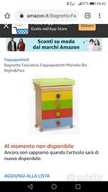 Bagnetto/fasciatoio in truciolare, piano ribaltabile con dispositivo di sicurezza, ampi cassetti, vaschetta anatomica estraibile con rubinetto per lo scarico, 4 ruote piroettanti. Versione Righe&Pois: maniglie in dotazione; dimensioni prodotto: H 99 | P 52 | L 69; dimensioni imballo: V-m3 0,336 | Peso 39 kg. ATTENZIONE: Non lasciare mai il bambino incustodito, sia nel bagnetto che nel fasciatoio. Con una semplicissima operazione, il bagnetto fasciatoio per la prima infanzia, si trasforma in una comoda ed elegante cassettiera d'arredo. Caratteristiche il bagnetto/fasciatoio MONELLO Osservano le normative di sicurezza europee. Garanzia Foppapedretti Le vernici usate sono atossiche. I materiali usati non sono nocivi. Ruote piroettanti, gommate di cui due dotate di sistema frenante. SISTEMA EASY SYSTEM Apertura facilitata dal piano fasciatoio ribaltabile dotato di fermo sicurezza. Maniglie atossiche intercambiabili applicabili ad antine e cassetti. Dotato di cassetti ad alto scorrimento con fermo per evitare lo sfilamento.