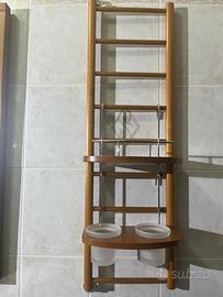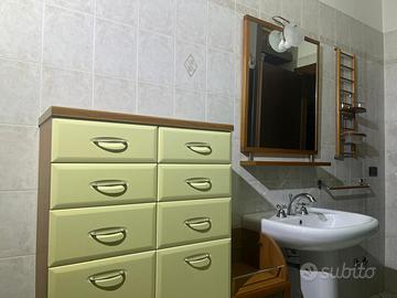 Il bagno è composto da un mobile grande con cassetti un mobile con due cassetti più piccolo con ruote uno specchio con mensola di appoggio e lampada una parete attrezzata con due mensoline un lavandino con colonna completo di rubinetteria un porta asciugamani in acciaio e legno e altri piccoli accessori,il tutto in ottime condizioni (non è truciolare ma legno).