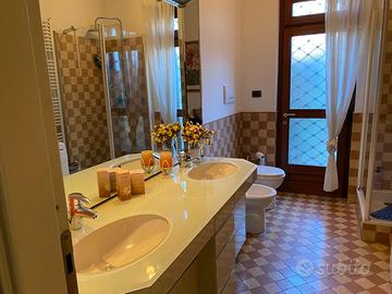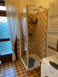 Bagno completo con mobile di alta qualità con doppio lavabo con specchiera illuminata (1,65 m), water e bidet, box doccia 70x90. Disponibile da aprile. Smontaggio e trasporto a carico dell’acquirente.