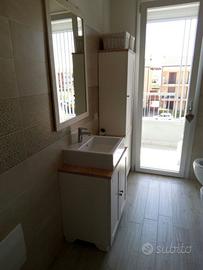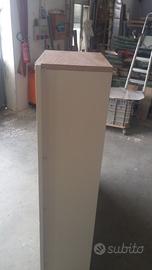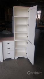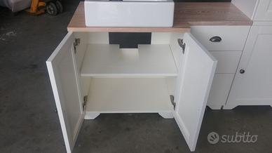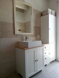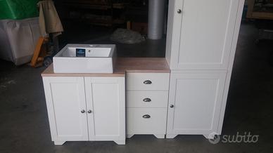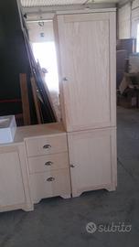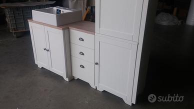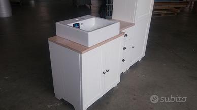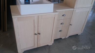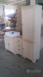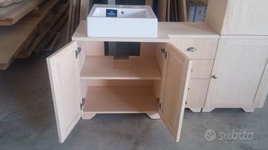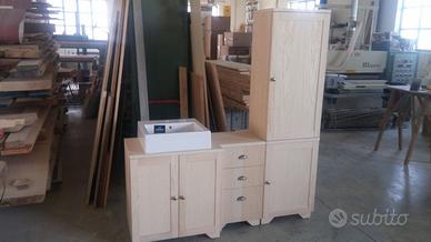 Mobile bagno con misura parte lavello lungh.70 prof. 50 h 76 + (14 del lavello che ha portato il cliente) composta da 2 ante che si apriranno su cerniere da cucina regolabili ammortizzate con ripiano con scanso per i tubi, parte centrale cassettiera con 3 cassetti su guide ammortizzate larga 40 cm e prof. 40 h 76 e lato dx con colonna misura lungh.50 prof.40 h180 composta da 2 ante e 5 ripiani interni aggiustabili. Apertura delle ante su cerniere da cucina regolabili. Gambette in legno con leggera modanatura. Il materiale usato per il mobile bagno è listellare ricoperto con essenza di frassino che poi verrà spazzolato e le ante saranno con telaio in massello di frassino con pannello in multistrato ricoperto di frassino. Interno dei cassetti costruiti in faggio massello con pannello in multistrato da 0,8 cm come fondo del cassetto. schienale in multistrato di frassino con dovuti trafori per tubi. nel prezzo completo di finitura laccata bianca rall 9010 con prodotto esclusivo per bagno e coperta sbiancata come richiesto dal cliente, compreso di maniglie franco fabbrica iva non comprendente, lavello e miscelatore non compreso. mobile già costruito e venduto su commissione non teniamo magazzino ma essendo i diretti produttori falegnami possiamo riprodurlo uguale o con modifiche da apportare dato che siamo i diretti costruttori per dubbi contattateci. ASTENERSI RIVENDITORI E COMMERCIANTI
