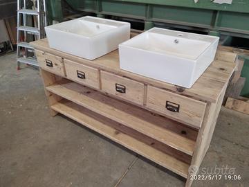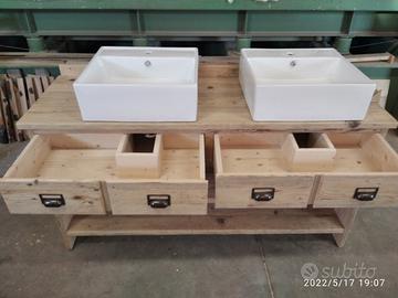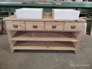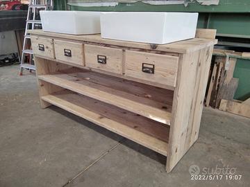 mobile bagno in legno vecchio recuperato di antichi solai o parancole restaurate e spazzolate con misura lungh.150 prof. 50 h 75 sopra suddiviso 2 cassetti posti appena sotto al piano che scorreranno su guide in legno (in cui troveremo il cassetto doppio con 2 frontali applicati con relativa maniglietta con scanso per passaggio tubi.) sotto troveremo 2 vani a giorno in legno vecchio (1 ripiano fisso sotto fondo) mentre altro aggiustabile in altezza con ferramenta adatta e schienale posteriore in legno vecchio. il mobile sarà fino a filo terra supportato da tappi in gomma h 5 mm. maniglie a conchiglia e finestrella antichizzata. Completo di finitura naturale trasparente idonea x bagno per mantenerlo nel tempo non alteri il colore e non abbia problemi. escluso lavandino e miscelatore. Compreso finitura Iva non comprendente, costruito su commissione, non disponibile a magazzino ma possiamo riprodurlo DIRETTAMENTE DAL PRODUTTORE ASTENERSI RIVENDITORI O COMMERCIANTI