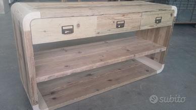 Mobile bagno in legno vecchio recuperato da travi e parancole da muratore, mantenendo la pattina originale che ha fatto il tempo negli anni, levigate e carteggiate in modo che siano morbide al tatto con misura lungh.140 prof.45 h 75 completo di 3 cassetti che scorreranno su guide in legno costruiti internamente in abete nuovo unito a coda di rondine, no schienale ma ripiano centrale fisso. Il cassetto centrale sarà meno profondo mentre quello laterale si sfrutterà lo spazio + profondo possibile. Il mobile appoggerà su tappi in gomma h circa 5 mm da terra in modo che il legno non sia diretto contatto con il suolo. Manigliette complete in ferro a conchiglia e vari fori per tubi e per lavello, unione avverrà su un travetto di abete da 10 x 10 su cui verrà fatta coda di rondine arrotondato mantenendo lo stesso spessore di tutta la tavole di circa 3,5 cm. e la finitura con effetto grezzo naturale trasparente impermeabile su bagno. essendo un laboratorio artigianale abbiamo costruito e venduto su commissione su specifiche del cliente, non teniamo magazzino ma dato che siamo i diretti produttori possiamo riprodurlo uguale o modificandolo in base alle proprie esigenze. il prezzo si intende franco fabbrica con finitura iva non comprendente. direttamente dal costruttore produttore falegname, costruiamo mobili su misura e piacere del cliente. ASTENERSI RIVENDITORI E COMMERCIANTI