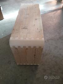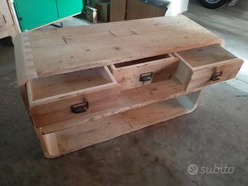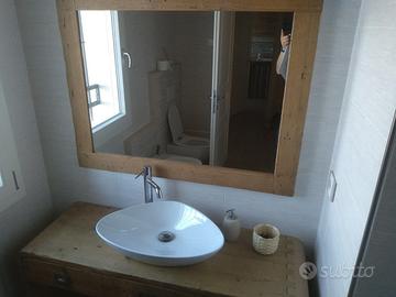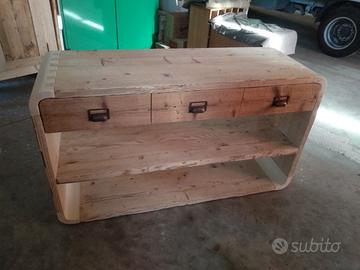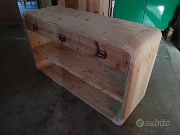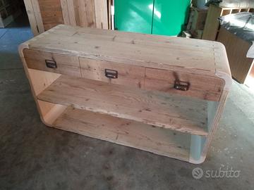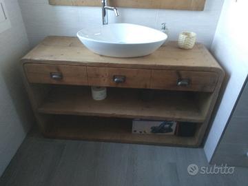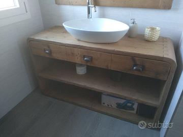 Mobile bagno in legno vecchio recuperato da travi e parancole da muratore, mantenendo la pattina originale che ha fatto il tempo negli anni, levigate e carteggiate in modo che siano morbide al tatto con misura lungh.135 prof.45 h 77 completo di 3 cassetti che scorreranno su guide in legno costruiti internamente in abete nuovo unito a coda di rondine, con schienale ma ripiano centrale fisso. Il mobile appoggia su tappi in gomma h circa 5 mm da terra in modo che il legno non sia diretto contatto con il suolo. Manigliette complete in ferro a conchiglia, unione avverrà su un travetto di abete da 10 x 10 su cui verrà fatta coda di rondine arrotondato mantenendo lo stesso spessore di tutta la tavole di circa 3,5 cm. completo di finitura lucidata effetto grezzo naturale trasparente. 01 specchiera con misura lungh.115 h 90 spessore 2,5 cm con foro per fissaggio a muro con spalle larghe 10 cm. e specchio con pellicola antirottura. essendo un laboratorio artigianale abbiamo costruito e venduto su commissione su specifiche del cliente, non è in pronta consegna e il prezzo si intende franco fabbrica con finitura e imballo iva non comprendente. direttamente dal costruttore produttore falegname, costruiamo mobili su misura e piacere del cliente. ASTENERSI RIVENDITORI E COMMERCIANTI.