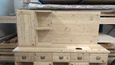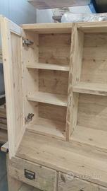 mobile bagno in legno vecchio recuperato di antichi solai o parancole restaurate e spazzolate con misura lungh.190 prof. 50 h 80 sopra suddiviso 5 vani in cui parte sotto troveremo a dx/ centrale e a sx vano a giorno con 1 ripiano parte centrale aggiustabile in altezza in legno vecchio, nel vano dx e sx in mezzo agli altri troveremo 2 ante che si apriranno su cerniere da cucina regolabili nascoste ammortizzate in chiusura con pomello su telaio e pannello inserito posteriormente, interno ripiano aggiustabile in abete, schienale in abete vecchio parte posteriore e traforato dove necessita. Parte superiore predisposto con 5 frontali cassetto ma in realtà troveremo (3 cassetti di cui 2 grandi ai lati e singolo parte centrale) su guide ammortizzate in chiusura interno cassetto in abete. nella parte a dx dove andremmo applicare il lavello si traforerà il cassetto traforato per far passare i tubi e apertura dei cassetti con maniglietta o pomello per le ante. PENSILE e specchiera: con misura lungh. 190 h 80 prof. 25 pensile avrà una larghezza di circa 40 con apertura su cerniere e pomello con ripiano interno, accanto troveremo 3 ripiani fissi con stessa profondità e restante pannello in cui andrà incollato lo specchio. Completo di finitura naturale trasparente idonea x bagno per mantenerlo nel tempo e perchè non alteri e non abbia problemi. esclusi lavandini e miscelatori. Completo di finitura specchio non comprende di iva. costruito su commissione ed esigenze del cliente, non è disponibile a magazzino ma essendo i diretti produttori falegnami possiamo riprodurlo uguale o in base alle proprie esigenze. per domande o dubbi contattateci P.S. disponibili a dare suggerimenti o chiarimenti in merito, per noi conta dare vita al vostro sogno DIRETTAMENTE DAL PRODUTTORE ASTENERSI RIVENDITORI O COMMERCIANTI