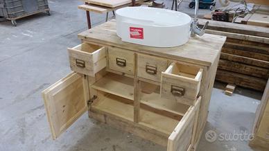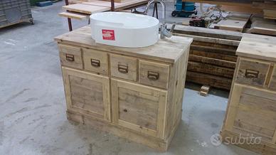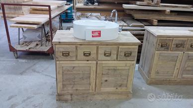 Bagno costruito come vecchia cassettiera di una volta con 3 cassetti e 2 porte misure lungh.90 prof.45 h78 costruita interamente con legno di assi vecchie intendesi con assi di vecchi solai di case rurali antiche, tutto al naturale come lo si vede in foto, lo si apprezza così come lo si vede al grezzo ben levigato in modo che sia morbido al tatto, solo con un pò di tinta sulle cornici dove viene battuta la fresa e resta bianco. la fila di cassetti sono singoli e nell parte centrale chiusi per i tubi del lavello con miscelatore. All'interno 1 ripiano aggiustabile con scanso nello schienale dei tubi. escluso lavandino e miscelatore. Dato che noi siamo i diretti costruttori li facciamo noi con le nostre mani siamo in grado di soddisfare qualsiasi richiesta che può essere su misura del cliente sia cassettiera o altro sia legno vecchio sia altro legno. il prezzo si intende franco fabbrica compreso di imballo e finitura trasparente impermeabilizzata adatta per il bagno non comprensiva di iva. il mobile è già stato prodotto e venduto su commissione del cliente di conseguenza non teniamo magazzino ma essendo un laboratorio artigianale costruiamo noi con le ns mani in base alle proprie esigenze e specifiche caso in caso, per domande o dubbi contattateci P.S. eseguiamo MOBILI SU MISURA sempre con legno di abete antico o altro per noi conta dare vita al vostro sogno DIRETTAMENTE DAL PRODUTTORI. ASTENERSI RIVENDITORI E COMMERCIANTI