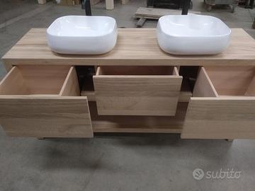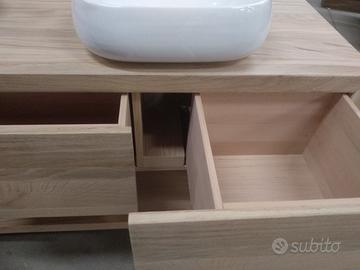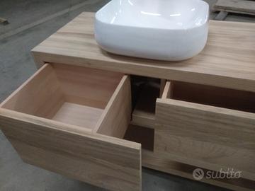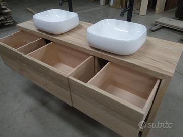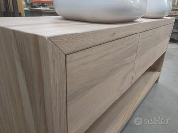 Bagno costruito in massello di rovere nuovo esenti crepi e spaccature con misura lungh. 170 prof 60 h 80 composto da 3 cassettoni che scorreranno su guide ammortizzate e interno in faggio massello con fondo da 8 mm, scanso ai lati per passaggio tubi sifon. I fianchi con la coperta e il ripiano sotto fisso in multistrato interno e rivestito ambo i lati con cartelle in massello da 1 cm per avere la bilanciatura perfetta e duratura nel tempo in legno di rovere e successivamente unito a 45° con apposita ferramenta in tutti i lati, frontale cassetto anch'esso a 3 strati leggermente + basso in modo da permettere apertura. tutto con spessore 5 cm completo di finitura effetto grezzo naturale trasparente idoneo per il bagno. Sotto tappi in gomma in modo da sostenerlo da terra. ESCLUSO LAVELLO e MISCELATORE il mobile è già stato venduto e non teniamo magazzino ma dato che siamo i diretti produttori possiamo costruirlo in base alle proprie esigenze, preferenze e siamo in grado di soddisfare qualsiasi richiesta. il prezzo si intende franco fabbrica compreso di imballo e finitura non comprendente di iva. per domande o dubbi contattateci P.S. eseguiamo MOBILI SU MISURA sempre con legno di abete antico o altro per noi conta dare vita al vostro sogno DIRETTAMENTE DAL PRODUTTORE. ASTENERSI RIVENDITORI E COMMERCIANTI.