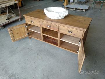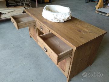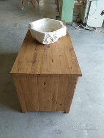 mobile bagno costruita in legno vecchio di antichi solai e parancole recuperati levigate leggermente in modo che siano morbide al tatto mantenendo la pattina originale naturale che il tempo ha fatto con misure lungh. 150 prof. 65 h 70 composto da 3 cassetti (1 centrale chiuso dx e sx sfruttabile) su cui verrà applicato frontale in legno vecchio con apposita maniglietta, scorrerà su guide in legno e internamente costruito in abete massello da 18 mm le sponde con fondo da 14 mm. La parte sotto suddivisa in 3 vani in cui ai 2 lati dx e sx troveremo 1+1 ante battenti con pomello per apertura laterali costruite con telaio e pannello inserito posteriormente sempre in legno vecchio, si apriranno su cerniere da cucina regolabili ammortizzate e internamente troveremo 1 ripiano aggiustabile per ogni modulo. Parte CENTRALE a giorno con 1 ripiano in legno vecchio aggiustabile in altezza per poter riporre asciugamani o altro e soprattutto con lo schienale traforato per passaggio tubi scarico sifon in abete da 14 mm. Completo di finitura naturale trasparente idonea x bagno per mantenerlo nel tempo, escluso lavandino e miscelatore. costruito su commissione ed esigenze del cliente, non è disponibile a magazzino ma essendo i diretti produttori falegnami possiamo riprodurlo uguale o in base alle proprie esigenze. per domande o dubbi contattateci P.S. disponibili a dare suggerimenti o chiarimenti in merito, per noi conta dare vita al vostro sogno DIRETTAMENTE DAL PRODUTTORE ASTENERSI RIVENDITORI O COMMERCIANTI