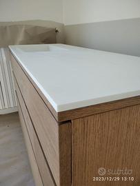 mobile bagno costruito tutto in listellare ricoperto di ROVERE con misure lunghezza lungh.135 prof. 50 h 85 (appoggia direttamente a terra) su piedini aggiustabili incassati direttamente sul fondo del mobile, suddiviso 1 cassettone parte sotto in cui sarà alto circa 35 cm, interno in betulla sponde da 16 e fondo da 6 mm completo con schienale traforato posteriore al mobile da 8 mm in multistrato da 8 di rovere mentre traforato sullo schienale del cassettone con apertura a gola nella parte superiore. Parte superiore 2 cassetti in cui al centro si apriranno sopra per il cassetto sotto e viceversa per quello sopra, guide ammortizzate in chiusura marca grass wurth, zoccolo parte sotto rialzato di circa 8 cm da terra e rientrante leggermente, finitura effetto grezzo naturale trasparente. Top spessore 1 cm con applicato lavello in corian bianco materiale non poroso e omogeneo, composto da circa 1/3 di resina acrilica (conosciuta anche come polimetilmetacrilato o PMMA), e circa 2/3 di sostanze minerali naturali con foro per miscelatore e piletta (non inclusi) lavello con misura 45 x 30 h 11.