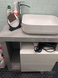 Piacenza per info 3455228279 bellissimo set completo per arredo bagno dal design moderno e pulito. Il mobile è caratterizzato da un robusto piano in finitura grigio cemento che conferisce un tocco industrial ed elegante all'ambiente. Il set è completo e pronto all'uso. Include tutto ciò che vedi nelle foto: 1. Mobile Lavabo: • Piano top in grigio cemento. • Due pratici cassettoni con frontale bianco lucido e maniglie integrate a gola, perfetti per riporre asciugamani, cosmetici e accessori. • Vano a giorno laterale per facile accesso. 2. Lavabo da Appoggio: Un elegante lavabo rettangolare in ceramica bianca, profondo e spazioso. 3. Miscelatore Monocomando: Elegante e moderno faucet cromato lucido con comando laterale. 4. Colonna Sospesa Salvaspazio: Una colonna alta e stretta, con un'anta bianca lucida e struttura laterale grigio cemento, coordinata perfettamente con il mobile principale. Offre moltissimo spazio aggiuntivo senza ingombrare. 5. Specchio da Appoggio Designer: Un pezzo unico con base nera sagomata e un pratico scomparto organizzatore integrato (bianco) sulla base.
