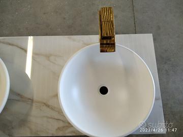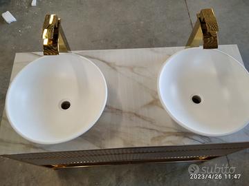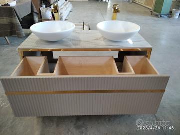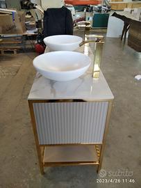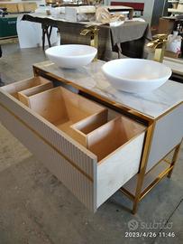 mobile bagno con misure lunghezza 120 prof. 45/50 h 92 costruito come da foto inviata dal cliente, con struttura perimetrale del mobile bagno in tubolare di ferro da 2,5 x 2,5 con tappi in gomma parte sotto e tutta la struttura di ferro successivamente GALVANIZZATA LUCIDA (applicato colore oro a mezzo di elettricità per avere una finitura perfetta e duratura nel tempo) in cui troveremo parte bassa fissa un ripiano in listellare di mdf da 25 mm color tortora per poter riporre asciugamani o altro, nella parte superiore troveremo 1 cassettone unico centrale in cui il frontale sarà tutto UNGHIETTATO interno cassetto betulla con varie traforature per passaggio sifon e scarichi con frontale laccato opaco con apertura su guide in ferro con apertura PUSH PULL a pressione e sistema integrato rallentato in chiusura completo di pannello di chiusura laterale e posteriore con foro per passaggio sifon e scarico da definire. TOP superiore con pannello di rinforzo e incollato parte superiore piastrella data dalla cliente in cui abbiamo fatta tagliare a misura, smussati gli spigoli e fatto i fori per lavello e miscelatori di entrambi i lavelli (escluso dal costo piastrella superiore 2 lavelli e 2 miscelatori) il tutto con finitura idonea per bagno. Iva non comprendente. costruito su commissione, non disponibile a magazzino ma possiamo riprodurlo DIRETTAMENTE DAL PRODUTTORE ASTENERSI RIVENDITORI O COMMERCIANTI