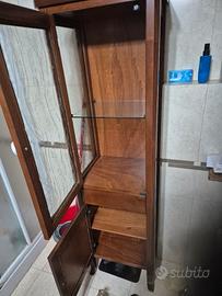 specchio con 2 luci porta oggetti sul lato destro con vetrinetta,colonna in legno stile arte povera con un cassetto e vetrinetta
