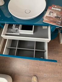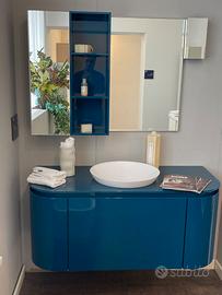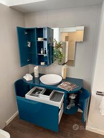 Bagno Scavolini mod.: "Rivo" colore laccato lucido Blu Baltico, tutto completo come foto incluso miscelatore cromato a muro GESSI mod. Tortona B13303, piano vetro lucido blu , lavabo in mineralmarmo ; dimensioni 120 L. x 52 prof..