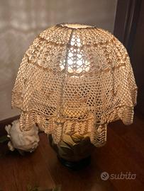 Lampada da tavolo con un design floreale in rilievo. Il paralume in pizzo aggiunge un tocco di eleganza.
