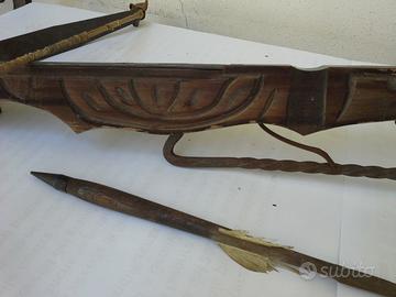 Balestra in legno e ferro, compreso una freccia. Lunghezza cm 93 larghezzacm 67. Legno intagliato, decorativa. Ottima pe rarredamenti in stile medievale, ma adatta anche in stanze per la caccia, salotti o librerie.