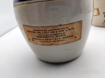 Particolare coppia di bottiglie da collezione Tullamore Dew e Ballantines sigillate in ceramica vintage, epoca seconda meta' del XX sec.