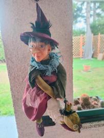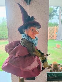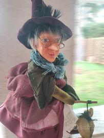 Vendo bambola Befana artigianale, realizzata con grande attenzione ai dettagli. Volto dipinto a mano con espressione simpatica, naso pronunciato e occhialini. Cappello a punta bordeaux con piuma, scialle verde e abito in tessuto nei toni del viola e rosa, arricchito da pizzi e tulle.