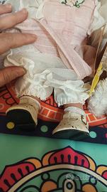 è una bambola da collezione non adatta a bambini ha un certificato di garanzia come vedete da foto la bambola rimane seduta e all'incirca di 30 cm è curata dei minimi particolari dal vestitino con la sottogonna e pantaloncini vaso i calzini e le scarpe in pelle all'orsetto che tiene nella mano come nelle foto non è in ceramica ma il materiale innovativo classico risale all'incirca metà anni 90 inizi anni 2000.