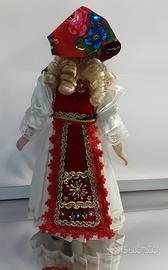 Bambola originale in costume della Romania, nuova e perfetta, rifinita in velluto rosso, passamanerie, pizzi e applicazioni di perle e paillettes, viso e mani di porcellana, altezza 32cm
